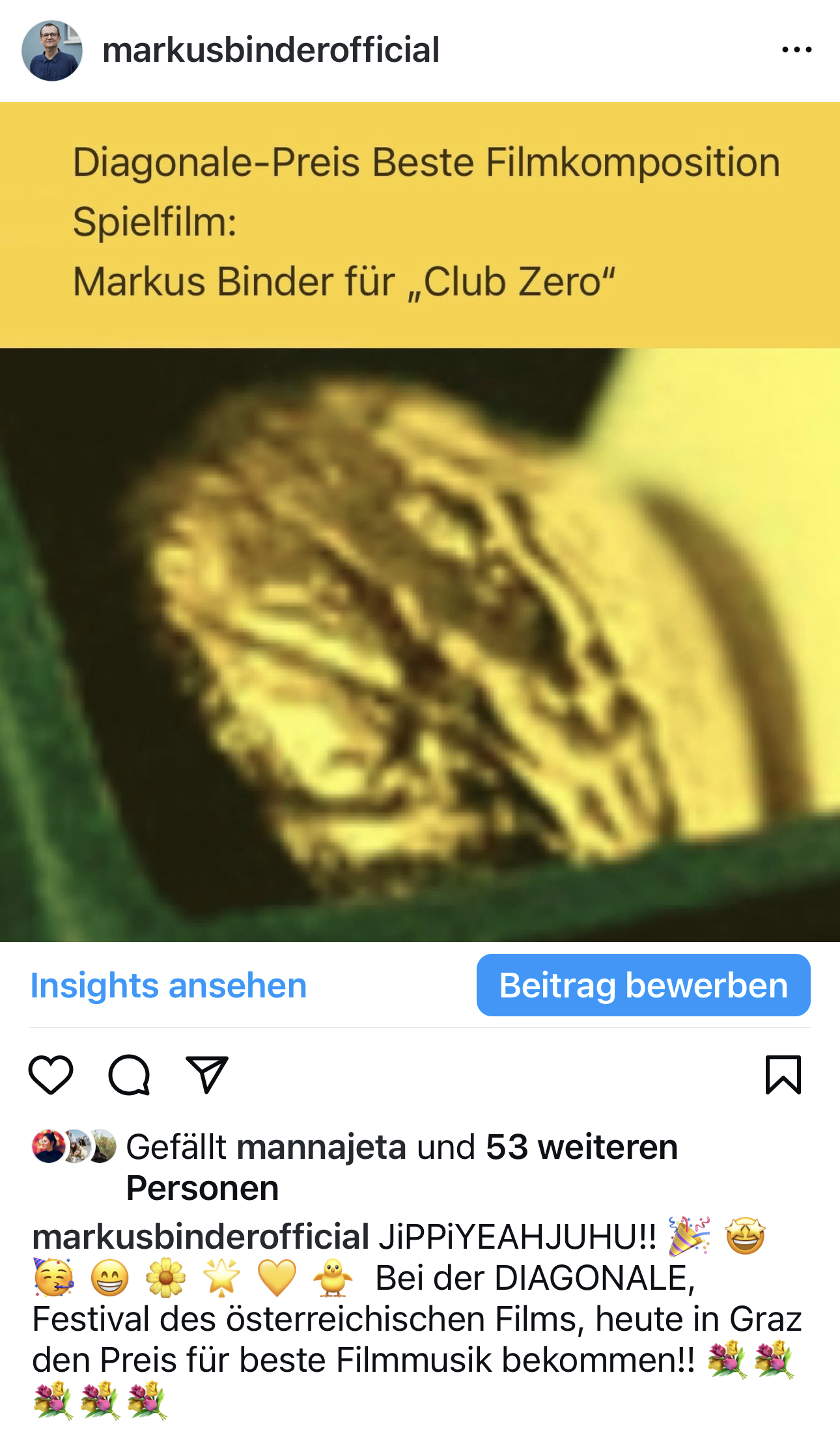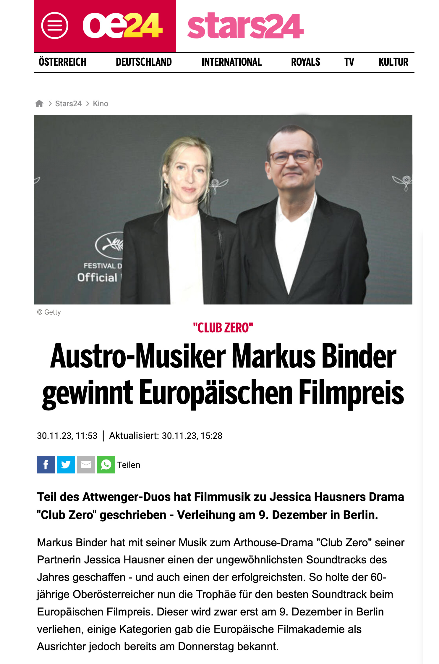 MARKUS BINDER: Man wird sehen, ob der European Film Award dazu führt, dass sich auch andere Produktionen dafür interessieren, dass ich die Filmmusik machen könnte. Ich habe bei CLUB ZERO die Erfahrung gemacht, dass es so viele interessante Aspekte gibt – das Zusammenspiel von Sound und Geschichte, aber auch bei mir selber die Idee, welche argen Sounds man erzeugen kann. Im Allgemeinen erlebe ich Filmmusik mit einem gewissen Defizitgefühl. Mein Eindruck der letzten Jahre ist der, dass selbst im Arthouse-Bereich recht formatierte Musik vorkommt, viel Klaviermusik. Ich erlebe immer wieder, dass ich mir denke „das war doch bei dem anderen Film auch so“, als ob es im Bereich der Filmmusik eine Konvention gäbe, die es zu erfüllen gilt. Ich kann mir nicht vorstellen, dass das im Interesse der Beteiligten ist. Dass meine Musik diesen Preis bekommen hat, bedeutet ja wohl auch, dass ein Sound, der in keiner Weise konventionell ist, geschätzt und gesucht wird. Wenn sich weitere Projekte ergeben würden, würde ich mich sehr freuen.
