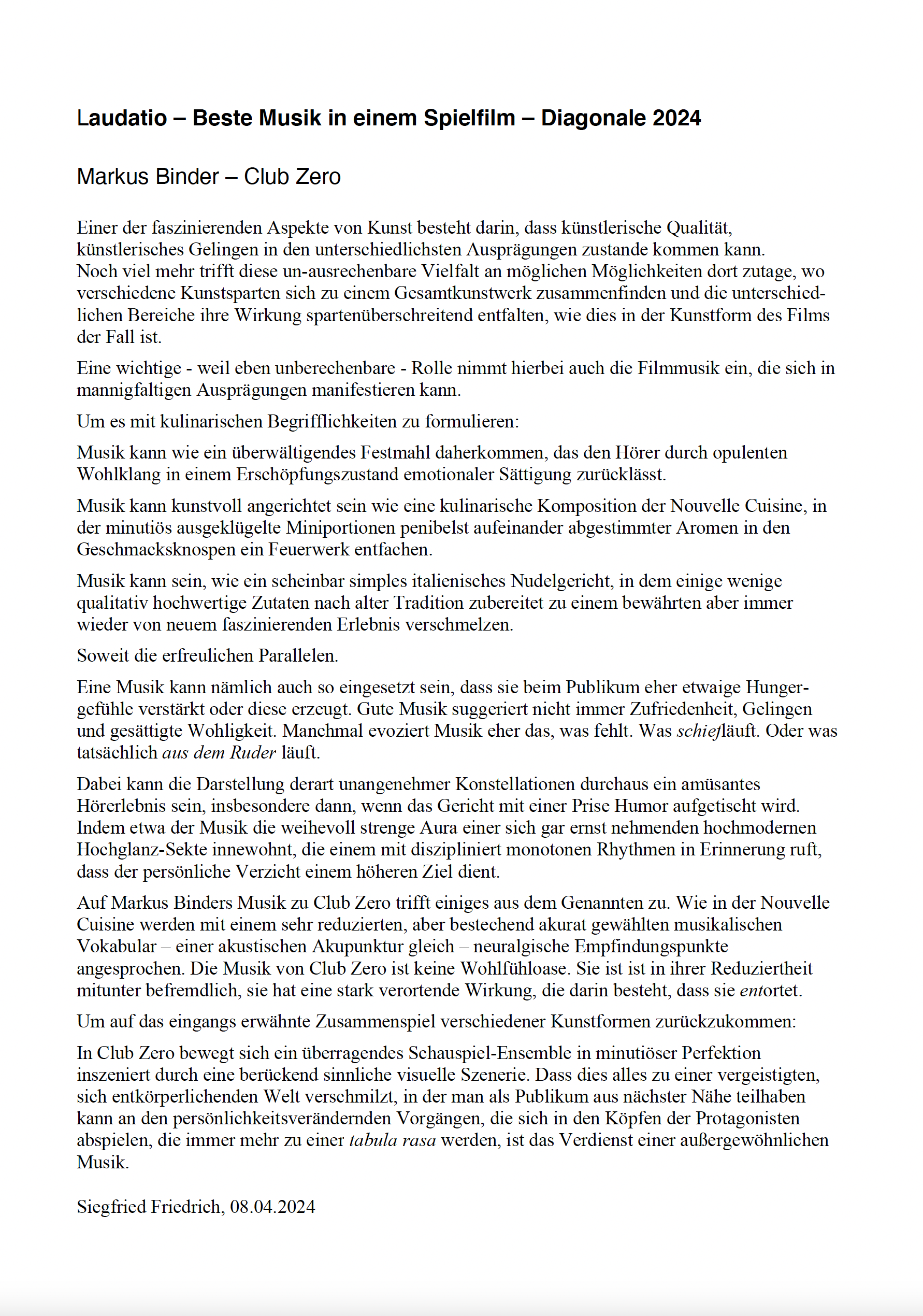 Seldom does a film score have such a distinctive character as that of Jessica Hausner’s CLUB ZERO. Sometimes it adopts a contrasting position to the European setting of the film, while at others it is self-confidently in the foreground of the action. It is intriguing, touching and surprising.