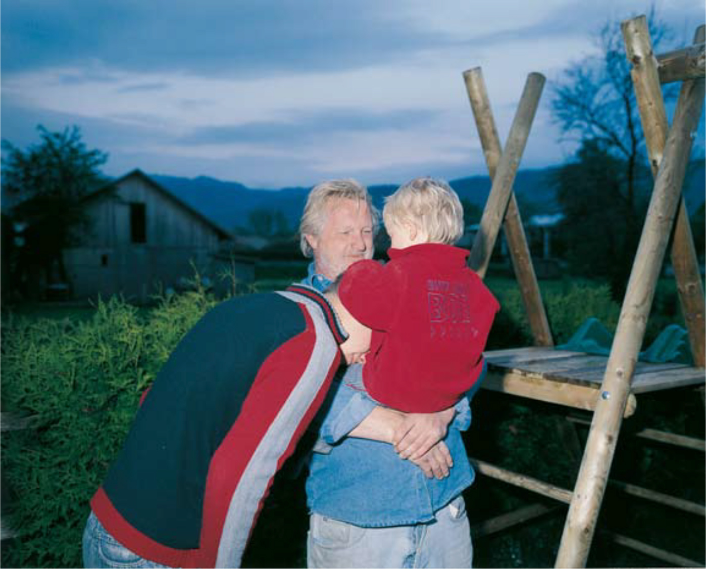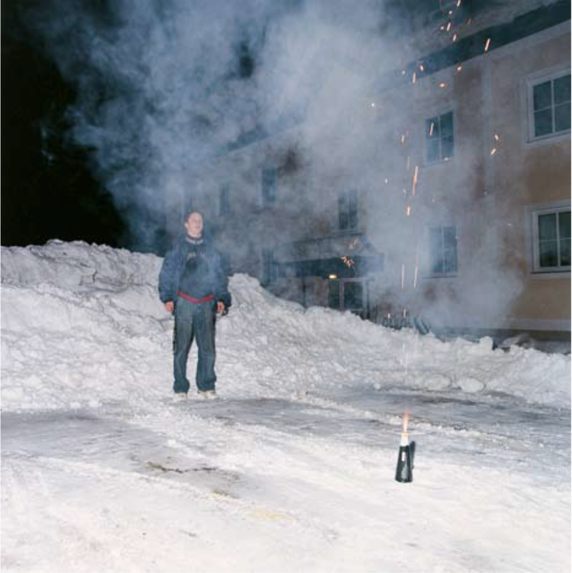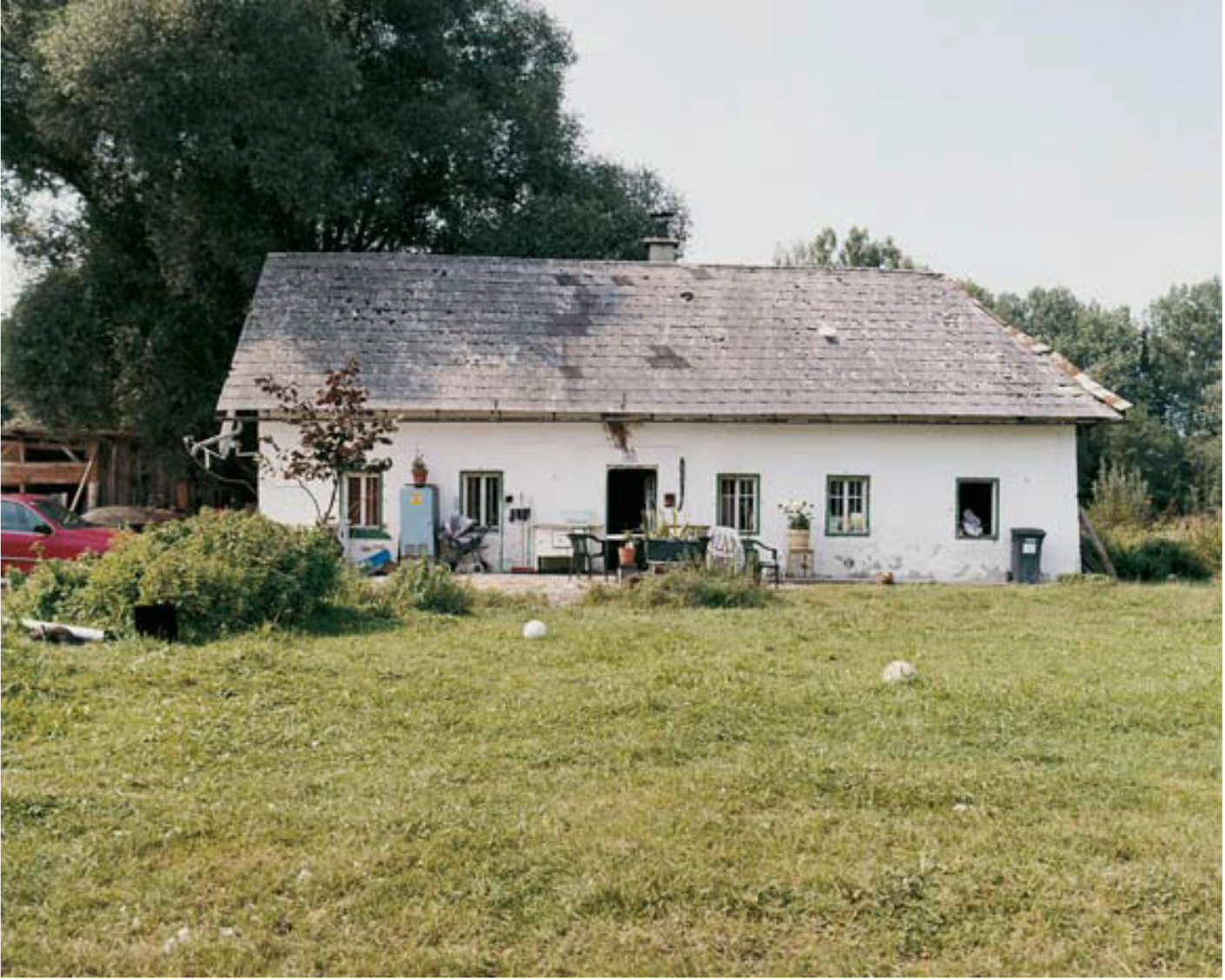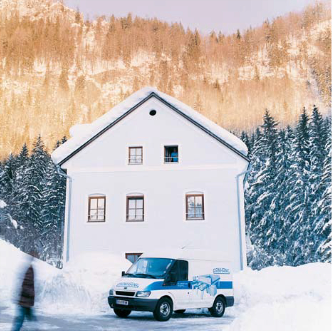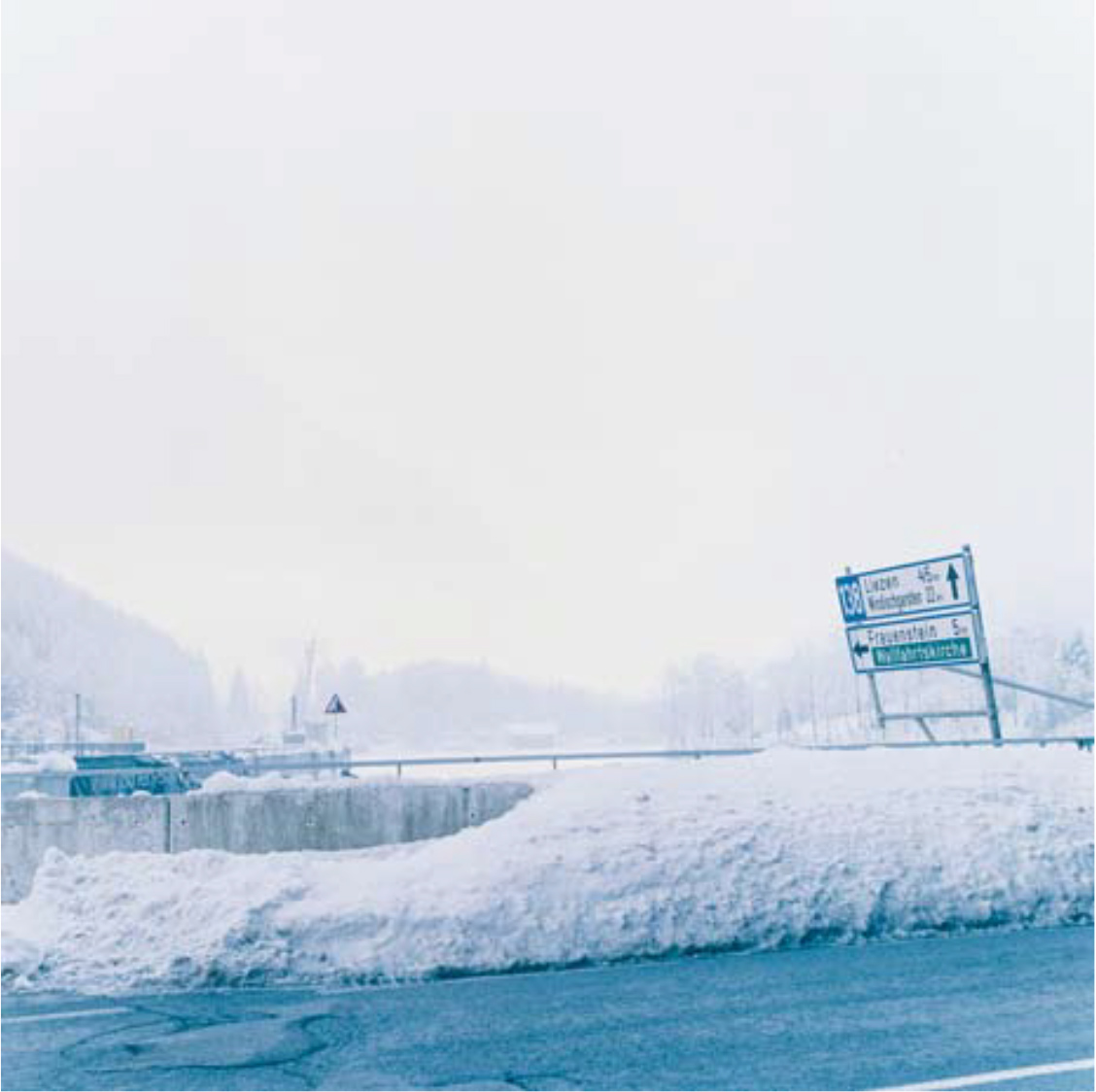 Als der Fotograf an einem Wintertag wieder zum Haus kommt ist es leer. Alle weg. Am Boden liegt Zeug: das Ofenrohr, eine Plastiktüte, eine Bürste, Kinderspielzeug, eine Giesskanne, 2 Tonkrüge stehen am Ofen, das gelbe Stanleymesser, eine Red Bull-Dose, im anderen Raum viele davon, mit leeren Red Bull-Dosen fährt die Formel 1, die Familie ist weg. Der Fotograf macht sich auf den Weg, sie zu suchen. Der Schneepflug hat den vielen Schnee an den Rand der Fahrbahn geschoben. Der Stausee, wo sich im Sommer die Bungee-Jumper die Staumauer hinunterstürzen, ist zugefroren, die Strassenschilder sehen aus, als würde sich keiner dafür interessieren, was draufsteht. Der Schnee ist die Hauptinformation. Die Strasse ist gesalzen, es ist ihnen heuer sogar schon mal das Salz zum Streuen der Strassen ausgegangen, so viel Schnee war. Die Mittelstreifen sind weiss wie Schnee, die Landschaft eine sogenannte Winterlandschaft, postkartenmotivmässig. In der Wohnung unter dem Dach wohnen sie jetzt. Als erstes wurde der Herrgottswinkel eingerichtet. Am Tisch liegt neben dem Babyflascherl ein Memphispackerl. Die Wände sind weiss und kahl. Der Christbaum ist mit bunten Kugeln geschmückt, der Boden mit einem PVC-Belag überzogen. Zu Silvester lässt Tom die Kracher krachen. Nach vier Monaten in diesem kahlen Haus mussten sie wieder ausziehen, sie waren zu laut gewesen, hiess es. Jetzt dann wieder in Schlierbach, in einem anderen Haus, da gibt es Zentralheizung, da wohnt auch noch eine andere Partei. Die Küche, die orange, ist wieder mit von der Partie, inklusive Herrgottswinkel, die Uhr vom früheren Haus auch, draussen Stangen zum Wäscheaufhängen, Kinderspieleinrichtungen, Rasen, der Boden drinnen ist aus Kork, saubere Sache. Der Vater hält das Baby im Arm, Tom legt seinen Kopf zwischen Vaters und Babys Brust. Im alten Haus liegen noch immer die Sachen am Boden, eine Batterie, ein Kondom, eine Plastiktube mit einem Rest irgendeiner Creme, Holzspreissel. Das Dach ist schon weg. Der Kamin bleibt noch aufrecht. Das Klosett liegt am Boden draussen, rund ums Haus die Dachziegel.
