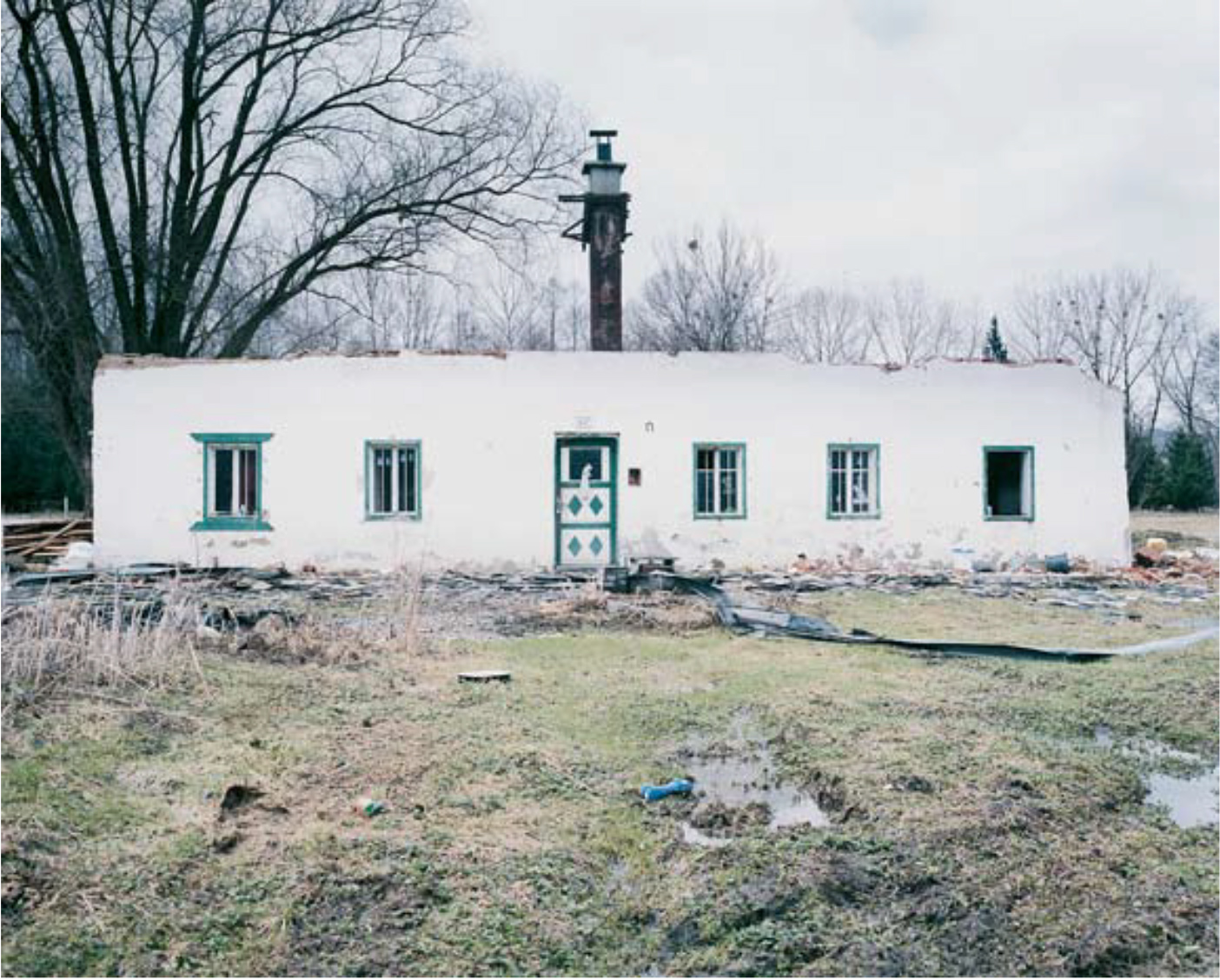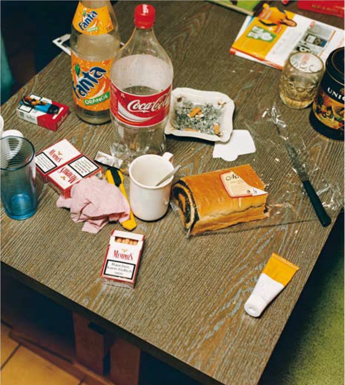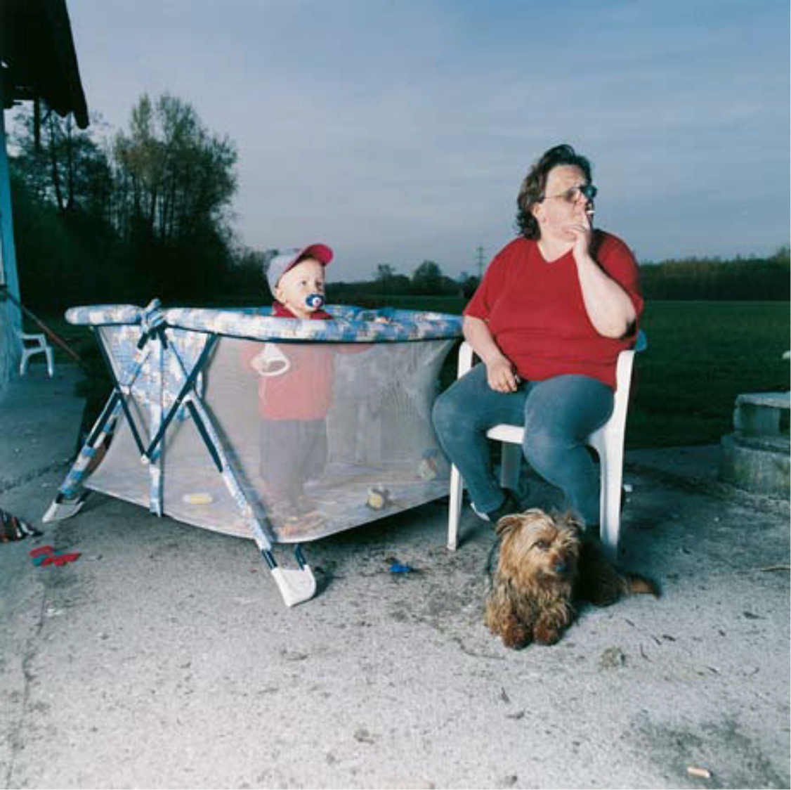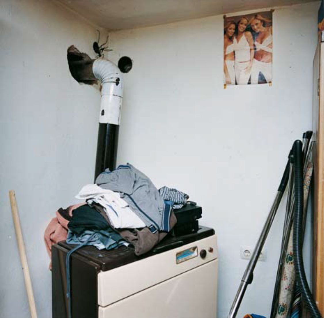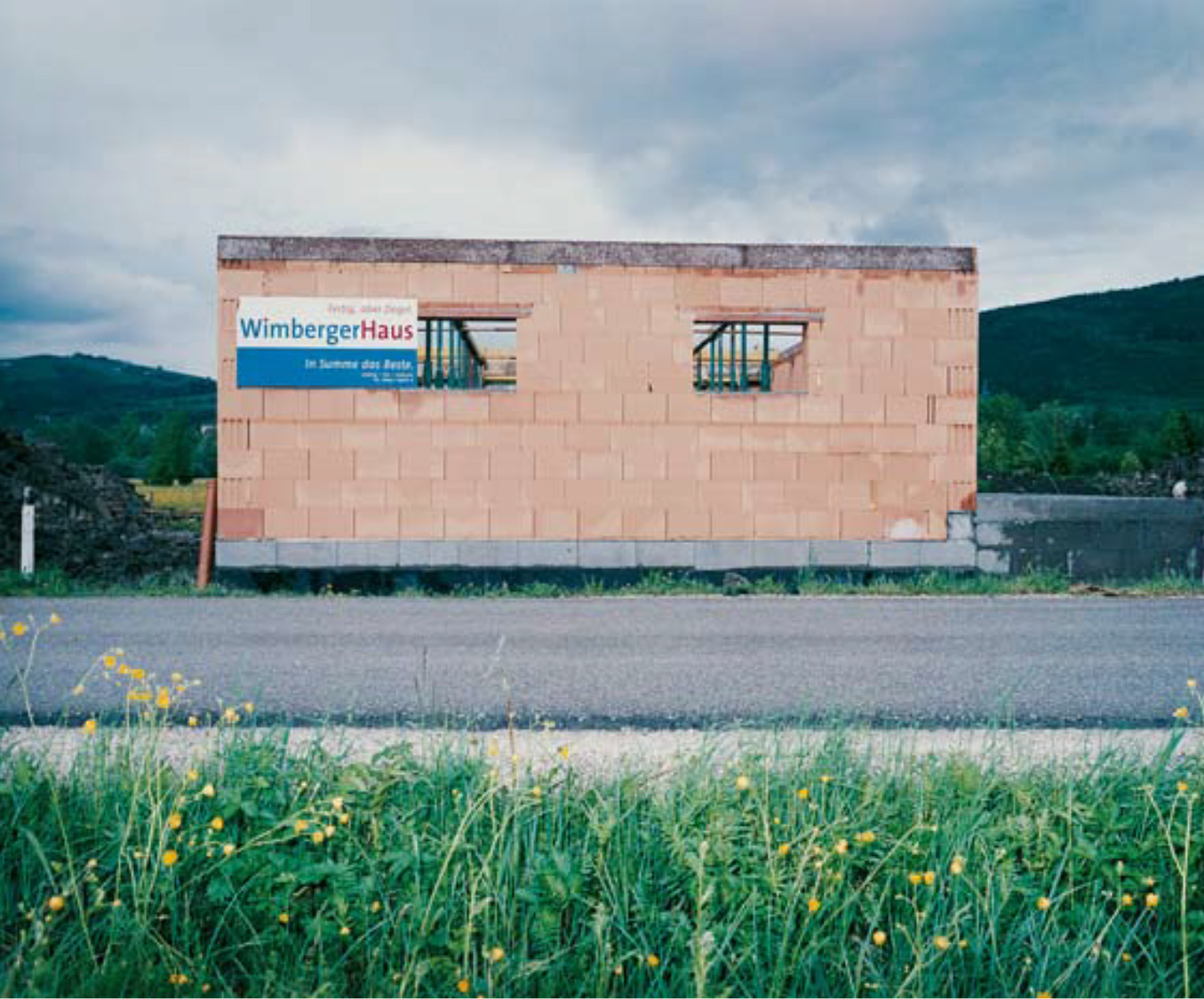 Als der Fotograf an einem Wintertag wieder zum Haus kommt ist es leer. Alle weg. Am Boden liegt Zeug: das Ofenrohr, eine Plastiktüte, eine Bürste, Kinderspielzeug, eine Giesskanne, 2 Tonkrüge stehen am Ofen, das gelbe Stanleymesser, eine Red Bull-Dose, im anderen Raum viele davon, mit leeren Red Bull-Dosen fährt die Formel 1, die Familie ist weg. Der Fotograf macht sich auf den Weg, sie zu suchen. Der Schneepflug hat den vielen Schnee an den Rand der Fahrbahn geschoben. Der Stausee, wo sich im Sommer die Bungee-Jumper die Staumauer hinunterstürzen, ist zugefroren, die Strassenschilder sehen aus, als würde sich keiner dafür interessieren, was draufsteht. Der Schnee ist die Hauptinformation. Die Strasse ist gesalzen, es ist ihnen heuer sogar schon mal das Salz zum Streuen der Strassen ausgegangen, so viel Schnee war. Die Mittelstreifen sind weiss wie Schnee, die Landschaft eine sogenannte Winterlandschaft, postkartenmotivmässig. In der Wohnung unter dem Dach wohnen sie jetzt. Als erstes wurde der Herrgottswinkel eingerichtet. Am Tisch liegt neben dem Babyflascherl ein Memphispackerl. Die Wände sind weiss und kahl. Der Christbaum ist mit bunten Kugeln geschmückt, der Boden mit einem PVC-Belag überzogen. Zu Silvester lässt Tom die Kracher krachen. Nach vier Monaten in diesem kahlen Haus mussten sie wieder ausziehen, sie waren zu laut gewesen, hiess es. Jetzt dann wieder in Schlierbach, in einem anderen Haus, da gibt es Zentralheizung, da wohnt auch noch eine andere Partei. Die Küche, die orange, ist wieder mit von der Partie, inklusive Herrgottswinkel, die Uhr vom früheren Haus auch, draussen Stangen zum Wäscheaufhängen, Kinderspieleinrichtungen, Rasen, der Boden drinnen ist aus Kork, saubere Sache. Der Vater hält das Baby im Arm, Tom legt seinen Kopf zwischen Vaters und Babys Brust. Im alten Haus liegen noch immer die Sachen am Boden, eine Batterie, ein Kondom, eine Plastiktube mit einem Rest irgendeiner Creme, Holzspreissel. Das Dach ist schon weg. Der Kamin bleibt noch aufrecht. Das Klosett liegt am Boden draussen, rund ums Haus die Dachziegel.