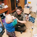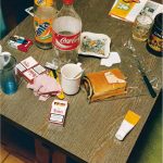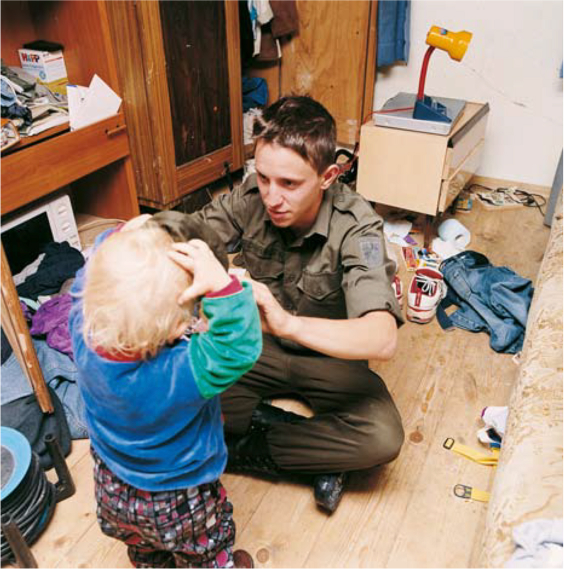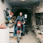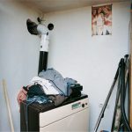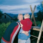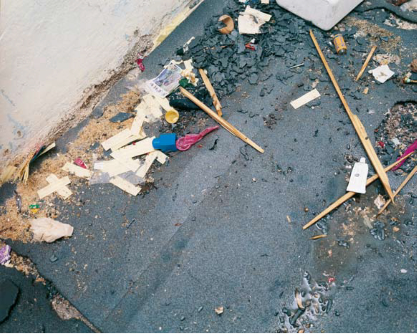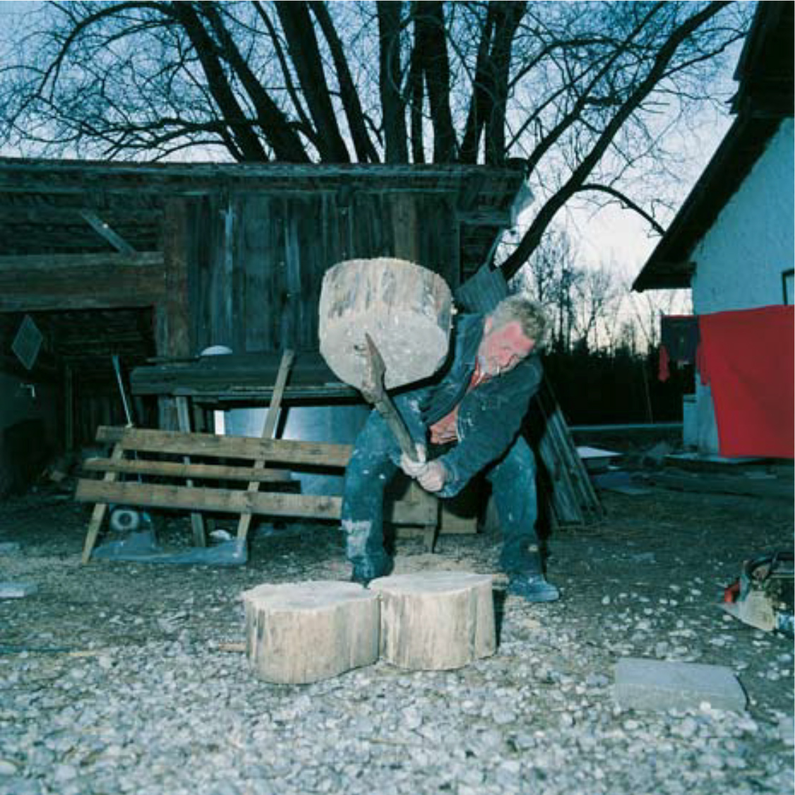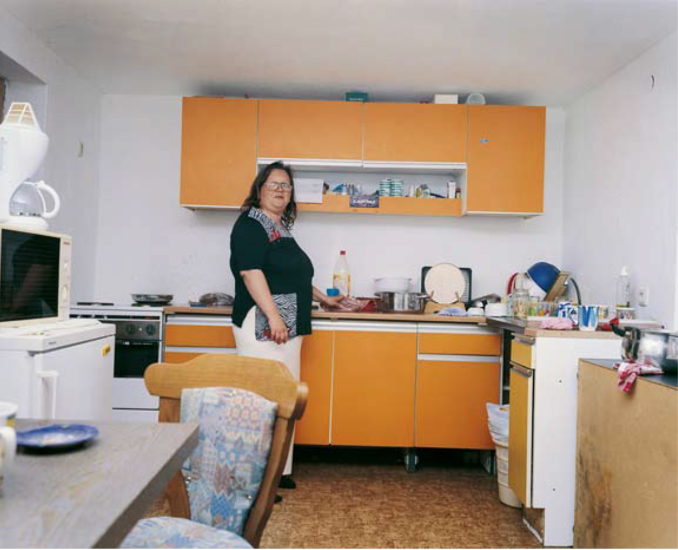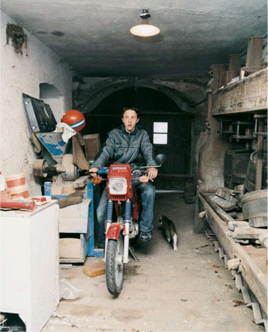 Als der Fotograf an einem Wintertag wieder zum Haus kommt ist es leer. Alle weg. Am Boden liegt Zeug: das Ofenrohr, eine Plastiktüte, eine Bürste, Kinderspielzeug, eine Giesskanne, 2 Tonkrüge stehen am Ofen, das gelbe Stanleymesser, eine Red Bull-Dose, im anderen Raum viele davon, mit leeren Red Bull-Dosen fährt die Formel 1, die Familie ist weg. Der Fotograf macht sich auf den Weg, sie zu suchen. Der Schneepflug hat den vielen Schnee an den Rand der Fahrbahn geschoben. Der Stausee, wo sich im Sommer die Bungee-Jumper die Staumauer hinunterstürzen, ist zugefroren, die Strassenschilder sehen aus, als würde sich keiner dafür interessieren, was draufsteht. Der Schnee ist die Hauptinformation. Die Strasse ist gesalzen, es ist ihnen heuer sogar schon mal das Salz zum Streuen der Strassen ausgegangen, so viel Schnee war. Die Mittelstreifen sind weiss wie Schnee, die Landschaft eine sogenannte Winterlandschaft, postkartenmotivmässig. In der Wohnung unter dem Dach wohnen sie jetzt. Als erstes wurde der Herrgottswinkel eingerichtet. Am Tisch liegt neben dem Babyflascherl ein Memphispackerl. Die Wände sind weiss und kahl. Der Christbaum ist mit bunten Kugeln geschmückt, der Boden mit einem PVC-Belag überzogen. Zu Silvester lässt Tom die Kracher krachen. Nach vier Monaten in diesem kahlen Haus mussten sie wieder ausziehen, sie waren zu laut gewesen, hiess es. Jetzt dann wieder in Schlierbach, in einem anderen Haus, da gibt es Zentralheizung, da wohnt auch noch eine andere Partei. Die Küche, die orange, ist wieder mit von der Partie, inklusive Herrgottswinkel, die Uhr vom früheren Haus auch, draussen Stangen zum Wäscheaufhängen, Kinderspieleinrichtungen, Rasen, der Boden drinnen ist aus Kork, saubere Sache. Der Vater hält das Baby im Arm, Tom legt seinen Kopf zwischen Vaters und Babys Brust. Im alten Haus liegen noch immer die Sachen am Boden, eine Batterie, ein Kondom, eine Plastiktube mit einem Rest irgendeiner Creme, Holzspreissel. Das Dach ist schon weg. Der Kamin bleibt noch aufrecht. Das Klosett liegt am Boden draussen, rund ums Haus die Dachziegel.