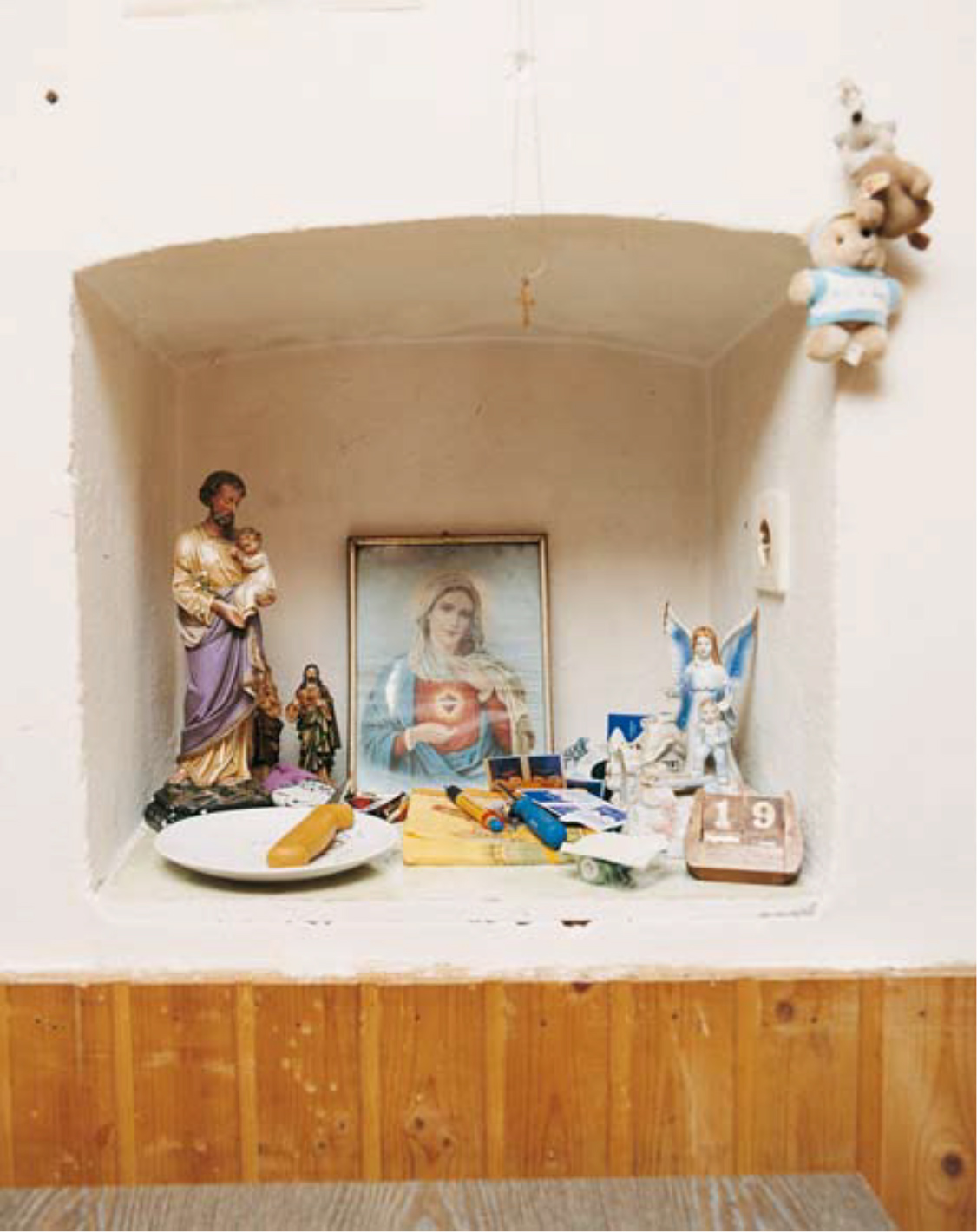 Wenn die Sonne scheint aufs Haus, wenn es warm ist, dann ist es drinnen super und draussen sowieso. Nicht dass wir nicht gern drinnen wären, drinnen im Haus haben wir alles, was wir im Haus brauchen, da können wir alles machen. „Kannst du mal das Baby holen?“ „Nein, geht jetzt nicht, Emra ist da, wir müssen nachsehen wegen dem Auto, aber ich geh schon, geht schon.“ Die Vorhänge, die Uhr, das Ofenrohr, der Herd, die Tschick, die Sachen, die Wäsche, der Himmel, wenn er so aussieht wie jetzt, der Bub lässt öfter mal was liegen, aber so findet sich dann auch alles, alles da, alles, womit wir auskommen, wir kommen zurecht. „Mach nicht wieder einen Lärm, wenn du spät nach Hause kommst, du wirst noch das Baby aufwecken.“ „Ja, ok.“ Im Winter müssen wir schon immer fest heizen, aber Holz ist genug da, das Scheidlkliam macht mir Spass, obwohl: Mehr Spass würde es schon machen, wenn sich das Holz von selber zerteilen würde, aber: Der Baum fällt auch nicht von selber um, geht nicht von selbst das Ganze, geht nicht anders. „Stell den Fernseher ein bissl leiser, ich muss das Baby niederlegen“. Das Fernsehen, das lenkt ab, sie bringen ja immer was anderes, die neuen Serien, leider ist es dann oft schon so spät, da freut es mich nicht mehr, da schlafe ich dann ein. Im Sommer, wenn wir draussen sitzen, da vergessen wir ganz aufs Fernsehen, ist auch egal, es geht einem nicht ab, ausserdem ist dann sowieso immer was zu tun, bei so einem Haus, da kommt immer was daher. Tom passt auf, auf sich. Wenn er mit seinem Bodybuildingapparat beschäftigt ist, da kennt er nichts. „Komm Tom, fahren wir!“ Die Burschen steigen ins Auto und verschwinden in die Nacht. Im Haus die Figuren. Josef hält das Kind im Arm, der heilige Josef, und drüben hängt das Bild, wo der Josef mit der Säge einen Balken auseinandersägt und der Jesus, der kleine, der hilft ihm. Bei denen hat sich das Holz auch nicht von selber zerkleinert, bei der heiligen Familie, und ob der Jesus jetzt der Sohn vom Josef ist, angeblich ja nicht, angeblich war da ja eine unbefleckte Empfängnis, laut Legende. Die Heiligenbilder sind hübsch, von der Mutter Maria ist auch eines da, da haben wir unten die Babyfotos draufgesteckt, das passt, die Maria passt auf den kleinen Martin auf. Was wirklich ein wenig Sonne in die Stube bringt, das ist das Orange in der Küche. Sicher ist Orange in der Küche manchmal für jemand etwas viel an Farbe, aber es bringt Helligkeit, das ist angenehm. Tom wieder: Ich mache halt ein bisschen was für meine Muskeln, das hält mich fit und dann beim Auto und wenn was anfällt. Aber jetzt muss ich dann sowieso zum Heer, da bin ich dann nur mehr am Wochenende da und da gehen wir dann auch mehr fort als dass wir daheim sind. Schätze ich mal. Wenn ich selber ein Haus hätte, würde ich mir das wahrscheinlich schon anders herrichten, aber weiss ich auch jetzt nicht wie, also es ist schon immer ganz gemütlich so. Es ist viel Platz rundherum und wenn meine Freunde kommen und sich in der Küche alles zusammendrängt und getratscht wird, das ist schon immer lustig. Die Militäruniform ziehe ich sonst gleich aus, aber jetzt hab ich sie angelassen, auch als Scherz irgendwie. Das Bild vom Opa in der Wehrmachtsuniform und da ist ja auch noch ein kleines Hakenkreuz dran, wenn du genau hinschaust, da ist mir dann ein cooler Sweater echt lieber. Der Opa, das war der erste Mann von der Mutter meiner Mutter. Die Marienbilder und das Kruzifix und die ganzen Sachen, ich hab das schon so oft gesehen, die sind schon lange da. Lange. Und was echt super ist, wenn es nach dem Essen duftet, wenn das brutzelt und prasselt und wenn ich ein bisschen mit dem Baby, dem Martin, spiele. Die Katzen laufen bei der Tür hinein und hinaus. Auf dem Küchentisch ein Wetexfetzen, eine leere 2-Liter-Pet-Cola-Flasche, eine halbleere 2-Liter-Pet-Fanta-Flasche, drei Packerl Memphis, ein Packerl Marlboro mit einem Feuerzeug drauf, ein Aschenbecher mit vier Tschickstummeln drinnen, ein halber Mohnkuchen in aufgebrochenem Cellophan, ein Messer mit schwarzem Plastikgriff, ein Seidlglas mit etwas Saft drinnen, ein gelbes Stanleymesser, ein deppada Werbeprospekt, ein leeres Glas, zwei leere Häferl. In der würfelförmigen Nische in der Wand ein Bildnis der Gottesmutter Maria, ein Porzellanengel, der heilige Josef mit dem Kind, noch ein kleiner Heiliger, ein Stapel gelbe Servietten, auf dem ein Kugelschreiber liegt und ein Schraubenzieher, daneben ein Teller. Auf dem liegt ein Messer. Vorne ist noch so ein Art Kalender, aus Holz und an der Seite, in der Wand, da ist eine Steckdose, da könnte das alles schön zum Leuchten anfangen, wenn es mit Strom ginge. Das Glück ist ein Vogerl. Wir wissen das. Nicht, dass wir wüssten, wie das geht mit dem Glück, das muss schon jeder für sich selbst wissen, aber ob das mit dem Glück etwas ist, das sich planen lässt, das glaube ich nicht. Natürlich überlege ich manchmal, Lottogewinn, was könnten wir nicht alles machen mit so viel Geld, ein neues Haus, Auto, Sachen, Reisen, aber was, von dem träumen ja eh alle, das bringt nichts und dann schaun wir uns trotzdem immer am Sonntag die Lottoziehung an, du weisst ja nie, was kommt und so ein bisschen Hoffnung haben wir alle. Das ist ein Bild von meiner Schwester und mir, da sehen wir lieb aus. Na und ich kenn schon die Blicke, wenn bei uns wieder so fesche, sportliche Radfahrer vorbeiradeln und dann ganz neugierig herschaun zu unserem Haus, als ob wir eine Touristenattraktion wären. Das sieht nicht so aus hier wie ein Einfamilienhaus, wie sie sich das alle bauen mit Schulden und Kredit und Sorgen, das wäre nichts für uns, auch wenn es oft mühselig wird, mit dem Kochen, dem Waschen, dem Wäscheaufhängen, dem Putzen, dem Baby. Aber da hilft er wirklich brav mit, der Peter, mein Mann. Er macht öfter das Flascherl und es sieht wirklich lustig aus, wenn er kostet, ob es nicht zu heiss ist. Der mit so einem kleinen Flascherl. Er ist ja nicht der Vat